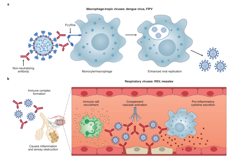 ADE has been documented to occur through two distinct mechanisms in viral infections: by enhanced antibody-mediated virus uptake into Fc gamma receptor IIa (FcγRIIa)-expressing phagocytic cells leading to increased viral infection and replication, or by excessive antibody Fc-mediated effector functions or immune complex formation causing enhanced inflammation and immunopathology (Fig. 1, Box 1). Both ADE pathways can occur when non-neutralizing antibodies or antibodies at sub-neutralizing levels bind to viral antigens without blocking or clearing infection.