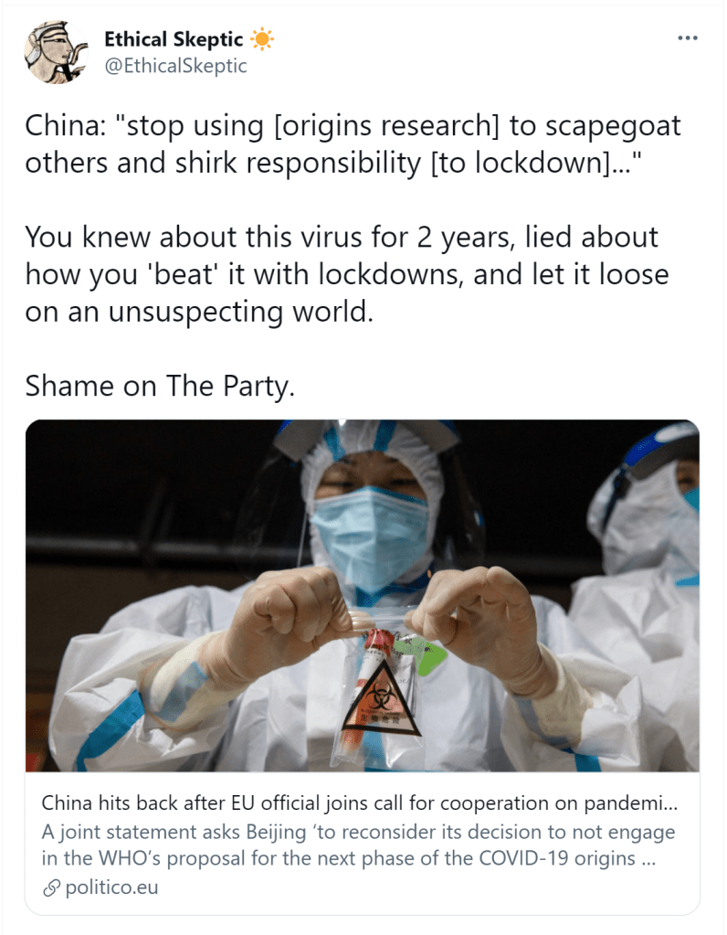 “You knew about this virus for 2 years, lied about how you ‘beat’ it with lockdowns, and let it loose on an unsuspecting world”