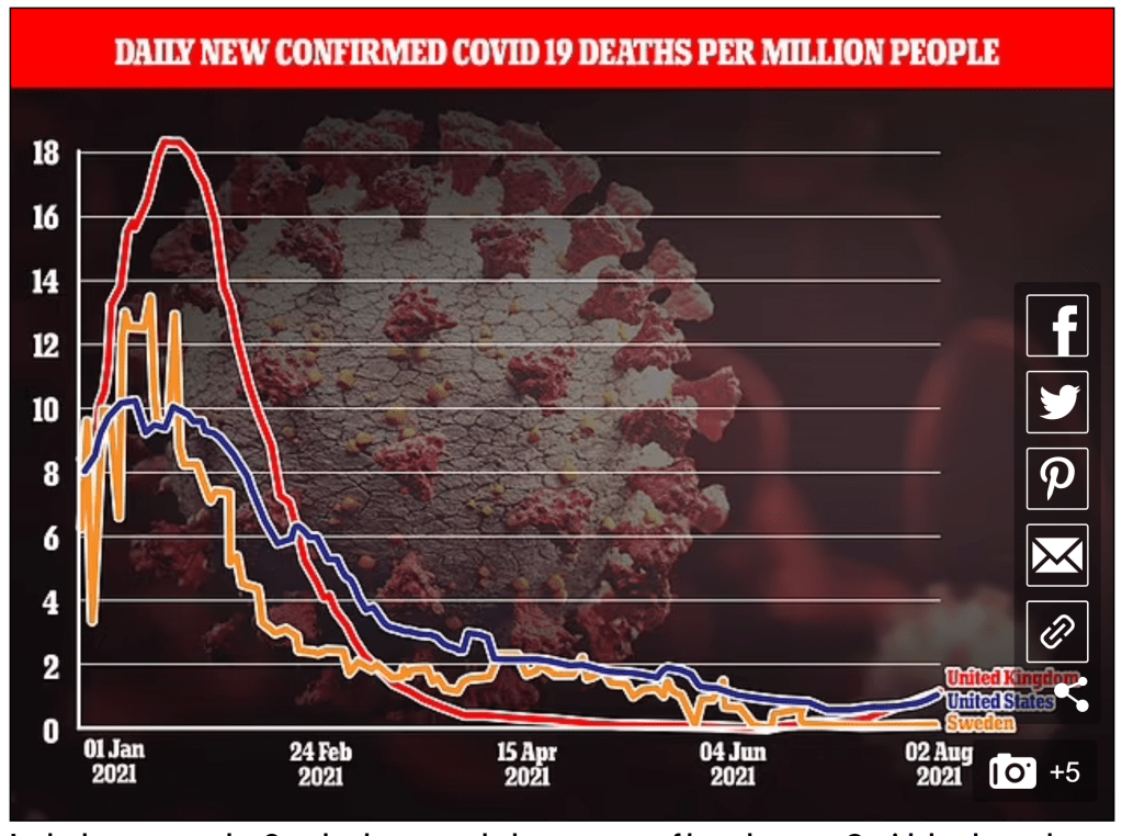 In the last two weeks, Sweden has recorded an average of 0.6 Covid deaths per day, this compares with 74 fatalities in the UK and 329 deaths in US per day over the same period.