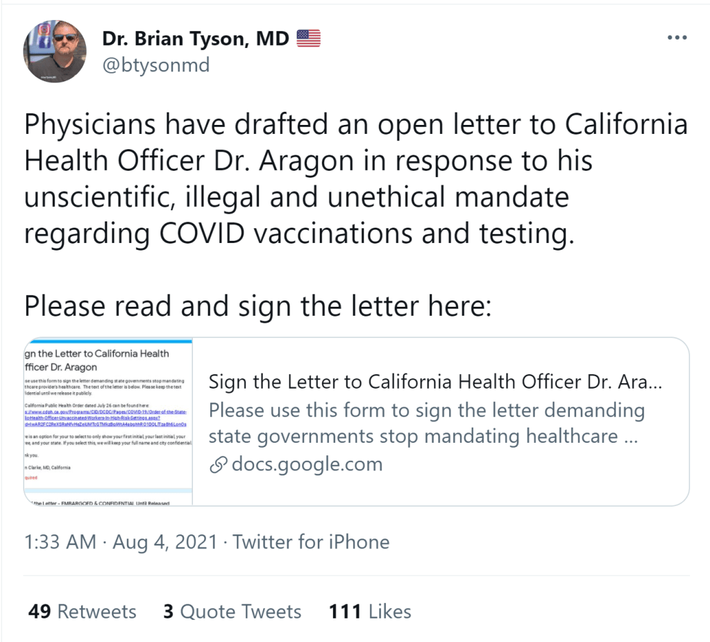 California: Open letter opposing vaccine mandate