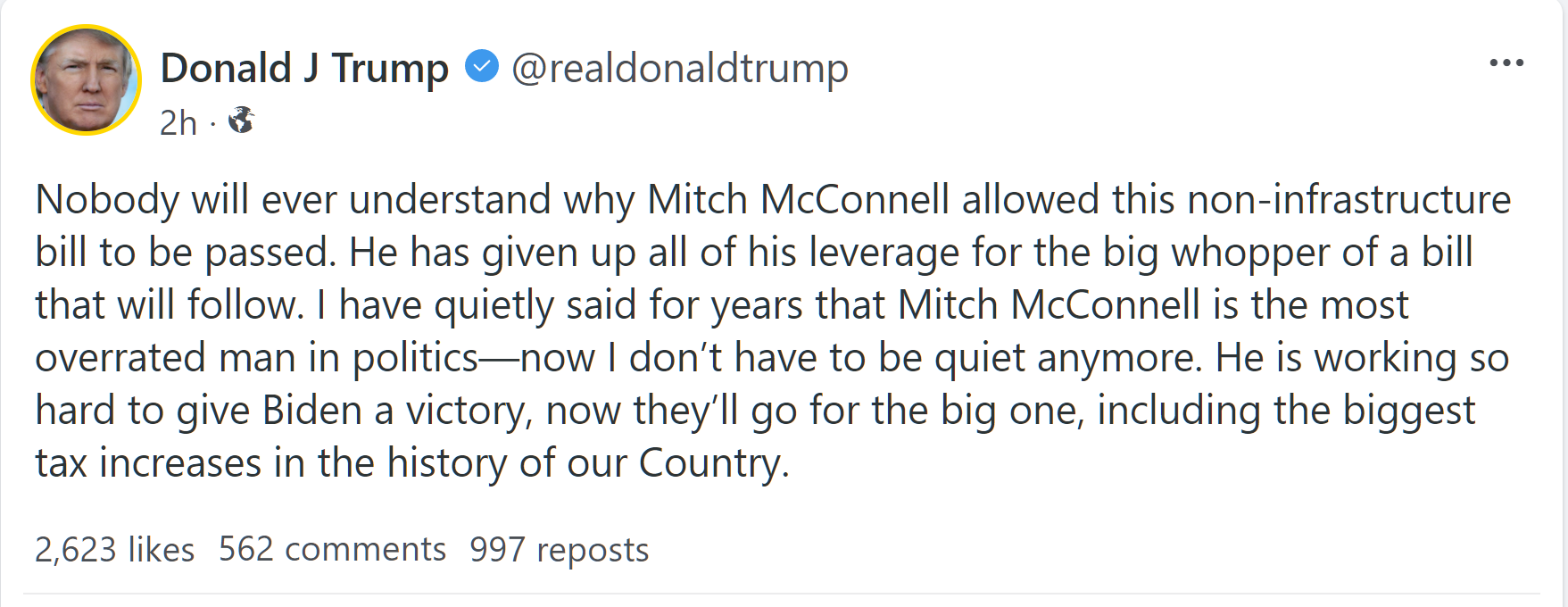 Trump on McConnell August 10, 2021 ~ ABN direct link Share this: Share on Reddit (Opens in new window) Reddit Share on X (Opens in new window) X Share on Facebook (Opens in new window) Facebook Share on LinkedIn (Opens in new window) LinkedIn Email a link to a friend (Opens in new window) Email Print (Opens in new window) Print Like Loading... Related Published by ABN View all posts by ABN