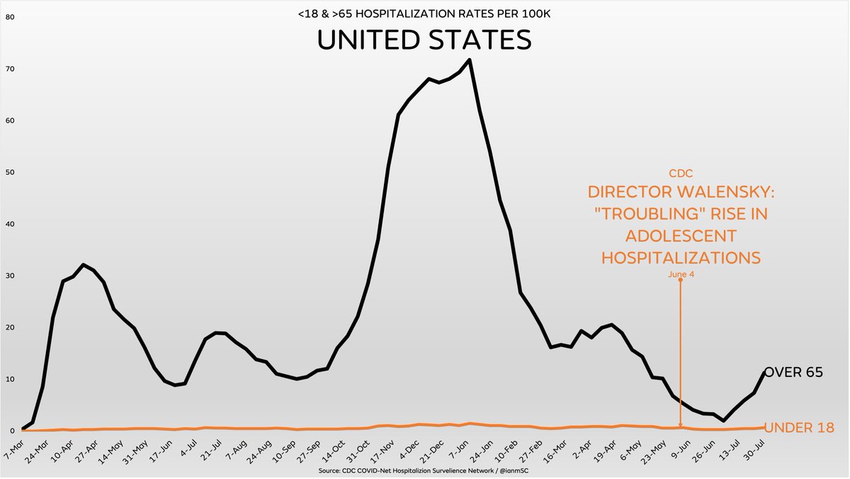 With all the hyperbolic panic about the delta variant impacting children with more severe illness and the anti-science push to mask kids in schools, it’s worth providing some perspective…as you can see, hospitalization rates for <18 are nearly nonexistent.