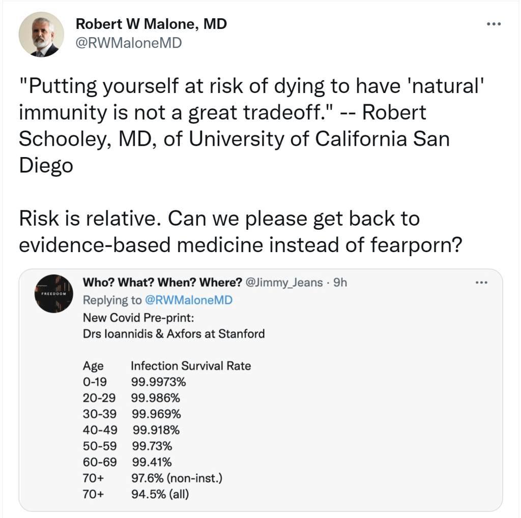 We all have the right to make this risk-assessment for ourselves. In addition to mortality age-rates, there are also the short, mid, and long-term dangers of the vaccines. Whatever you do, there is risk. Know thyself, know your own conditions, make your own decision and be open to change as conditions change. ABN