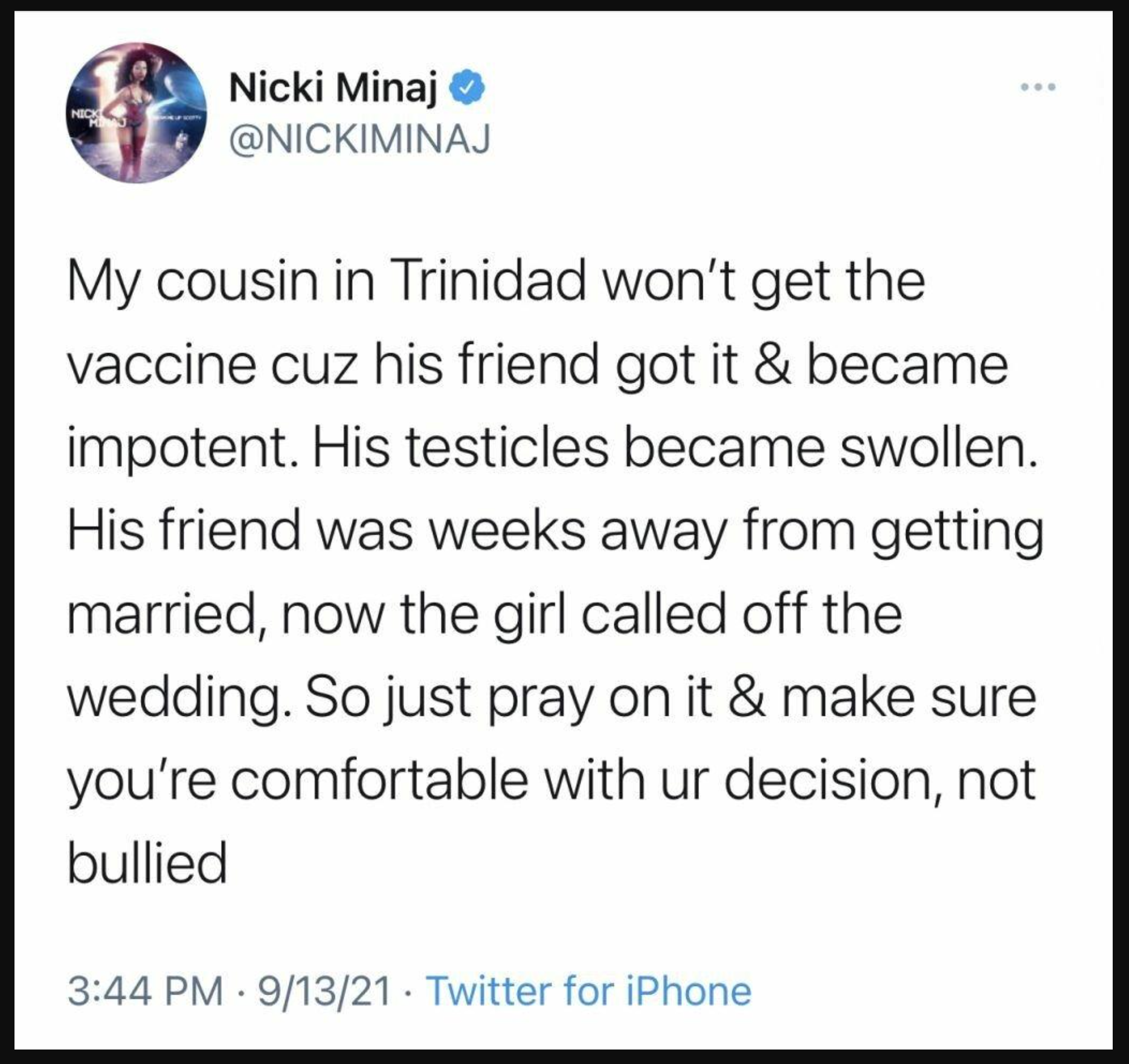NICKI MINAJ: “My cousin won’t get the vaccine cuz his friend got it & became impotent”