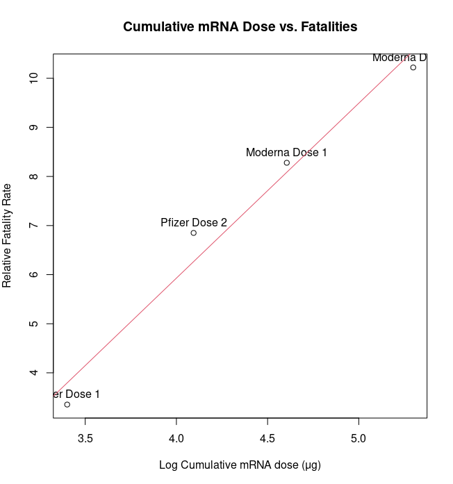 The obvious candidate in the Pfizer and Moderna vaccines is the dose of mRNA. From “mRNA-lipid nanoparticle COVID-19 vaccines: Structure and stability” https://www.ncbi.nlm.nih.gov/pmc/articles/PMC8032477/ we determine that each Pfizer shot contains 30 micrograms of mRNA, each Moderna shot contains 100 micrograms. Then from VAERS jan 1, 2021-sept 13, 2021 we determine the number of reports of fatalities within 30 days for Pfizer dose 1 (379), Pfizer dose 2 (774), Moderna dose 1 (627), Moderna dose 2 (774). We then need to normalize by the number of people vaccinated for each vaccine (113m Pfizer, 75.74m Moderna). If we divide the fatalities reported in VAERS by the total number of doses of each vaccine we obtain a relative fatality rate that is comparable across vaccines.