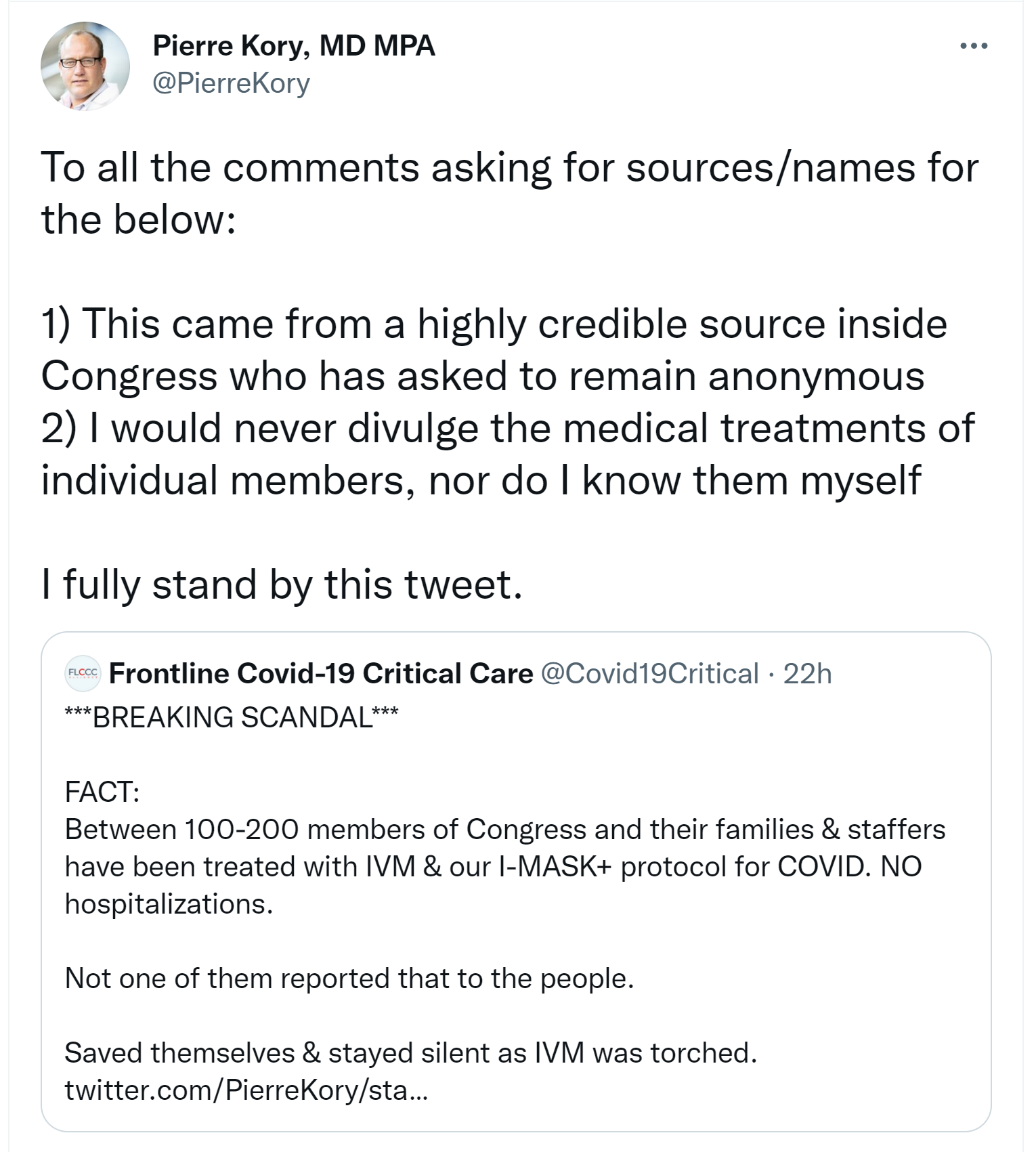 FACT: Between 100-200 members of Congress and their families & staffers have been treated with IVM & our I-MASK+ protocol for COVID. NO hospitalizations.