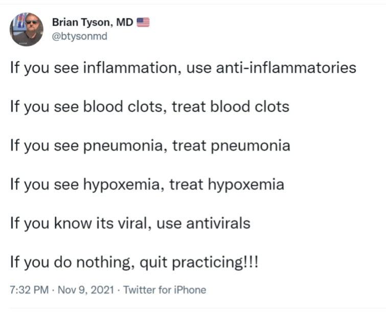 Failure to treat is malpractice. Failure to treat for all of the many months before there were (dubious) vaccines is one of the strangest things that has ever happened in the history of medicine. As Dr Tyson notes above, we have long had treatments for those conditions and long known how to identify them. Yet a vast conspiracy overcame the land and doctors almost everywhere abandoned their patients, often to die alone. ABN