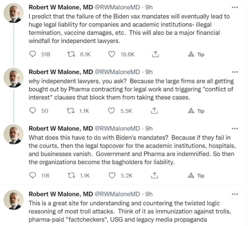 Malone: Vax mandate fails will leave academic institutions, hospitals, and businesses holding the liability bag