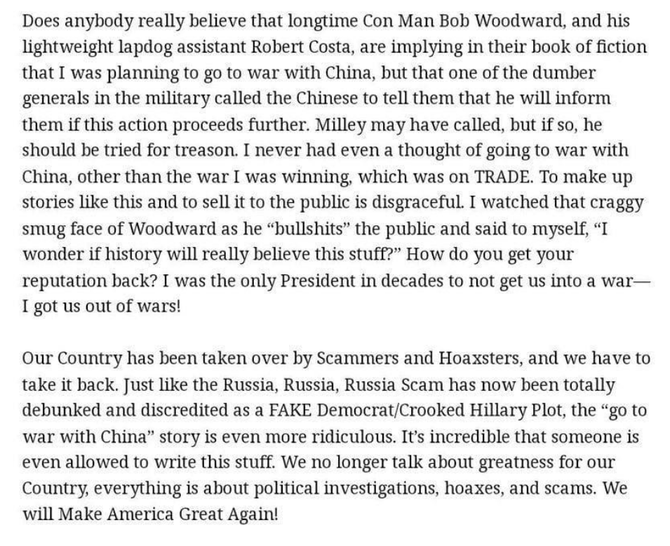 President Trump on Woodward’s “bullshit” story that he was “planning to go to war with China”