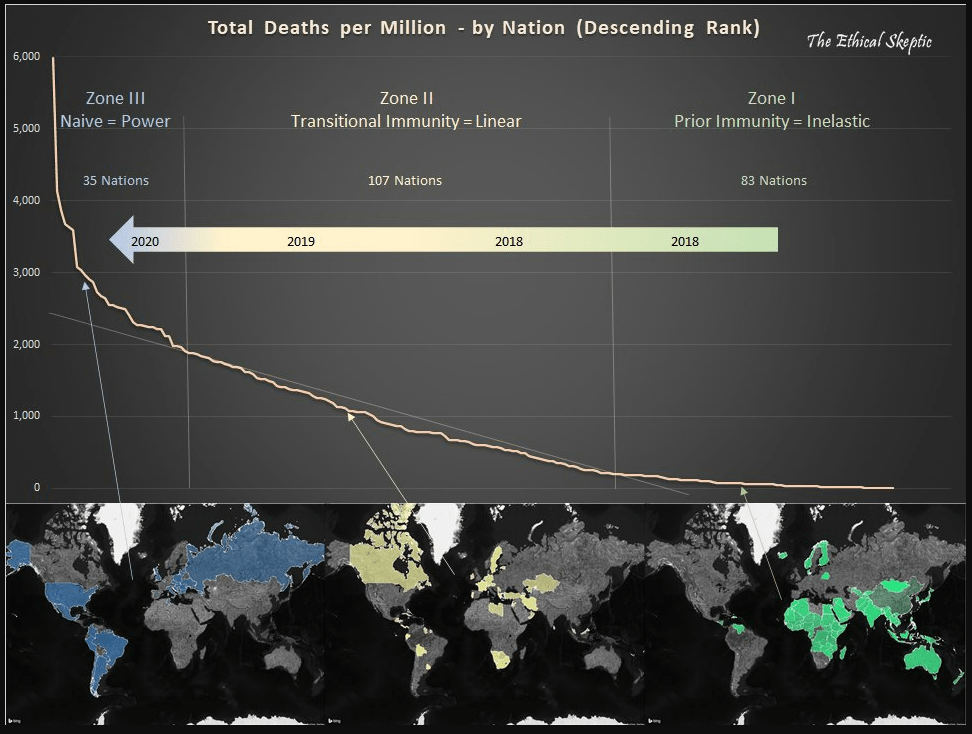 Covid may have been an accidental release of a bioweapon in 2017 in China or it may have been deliberate. In either case, Chinese and neighboring populations were largely inoculated (80%) against covid by this early release, while other parts of the world were less inoculated (30-50%) though they also had early exposure to the virus. This hypothesis is supported by “flu” data from 2017-2019 which shows a marked increase during those years in the green areas in the map above. ABN