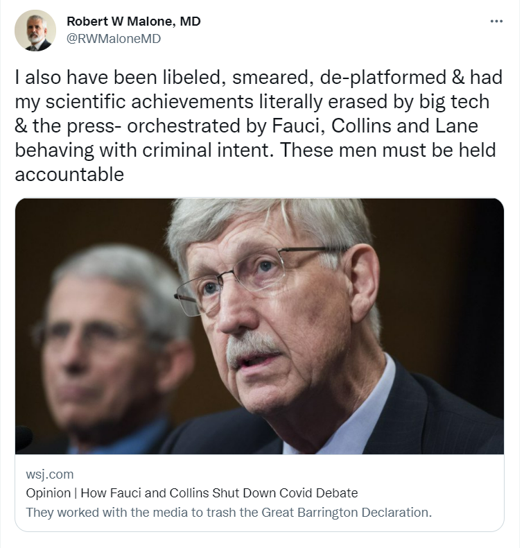 “I also have been libeled, smeared, de-platformed & had my scientific achievements literally erased by big tech & the press- orchestrated by Fauci, Collins and Lane behaving with criminal intent. These men must be held accountable”: Robert Malone