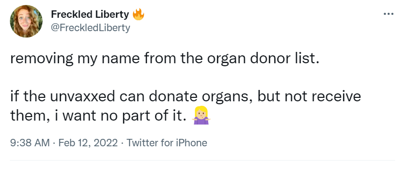 if the unvaxxed can donate organs, but not receive them… February 17, 2022February 17, 2022 ~ ABN Add to this millions of Americans being denied early treatment and hundreds of thousands dying in hospitals due to maltreatment. ABN Share this: Share on Reddit (Opens in new window) Reddit Share on X (Opens in new window) X Share on Facebook (Opens in new window) Facebook Share on LinkedIn (Opens in new window) LinkedIn Email a link to a friend (Opens in new window) Email Print (Opens in new window) Print Like Loading... Related Published by ABN View all posts by ABN