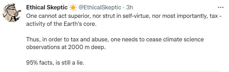 “In order to tax and abuse, one needs to cease climate science observations at 2000 m deep” March 27, 2022March 27, 2022 ~ ABN Exothermic Core Theory Originally tweeted by Ethical Skeptic ☀ (@EthicalSkeptic) on March 26, 2022. Share this: Share on Reddit (Opens in new window) Reddit Share on X (Opens in new window) X Share on Facebook (Opens in new window) Facebook Share on LinkedIn (Opens in new window) LinkedIn Email a link to a friend (Opens in new window) Email Print (Opens in new window) Print Like Loading... Related Published by ABN View all posts by ABN