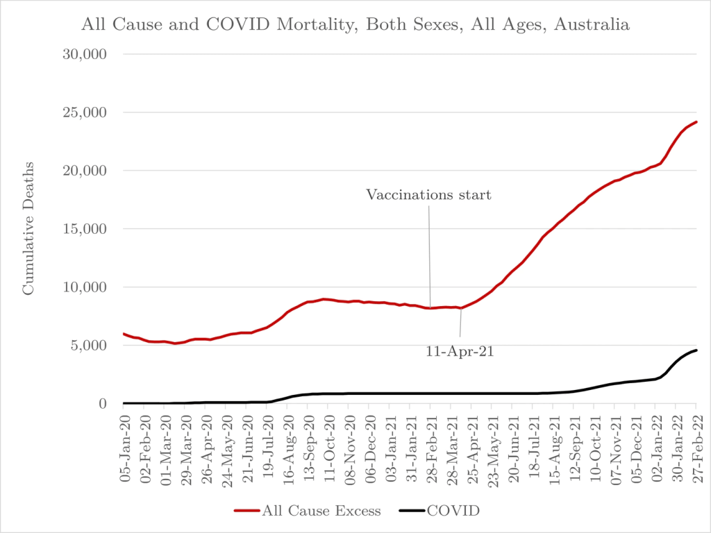 So, much like every other country of the world, Australia has had more COVID death since the COVID vaccine was introduced in Feb 2021 and substantially more excess death from other causes.