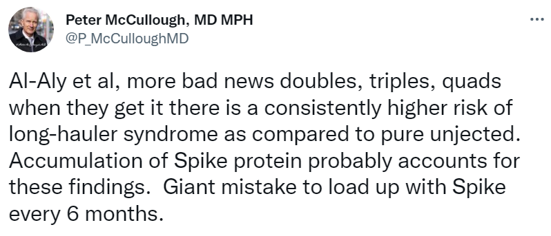 “Giant mistake to load up with Spike every 6 months”: Dr Peter McCullough May 29, 2022 ~ ABN Why boost a vax that didn’t work with a booster aimed at a virus that no longer exists? The result is guaranteed to be a weakened, dysfunctional immune system as observed in this paper. ABN Share this: Share on Reddit (Opens in new window) Reddit Share on X (Opens in new window) X Share on Facebook (Opens in new window) Facebook Share on LinkedIn (Opens in new window) LinkedIn Email a link to a friend (Opens in new window) Email Print (Opens in new window) Print Share on Pocket (Opens in new window) Pocket Like Loading... Related Published by ABN View all posts by ABN