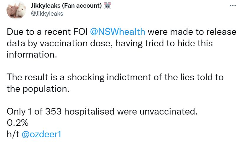 “Due to a recent FOI @NSWhealth were made to release data by vaccination dose, having tried to hide this information. The result is a shocking indictment of the lies told to the population. Only 1 of 353 hospitalized were unvaccinated – 0.2%”