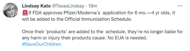 This includes no liability for adults harmed by the vaccines. Once FDA approves the vaccines for addition to the Official Immune Schedule for children, the vaccines are legally approved for all. This looks like a sneaky way to get blanket approval without the public realizing what is happening. Since they are at the end of any justification for EUA use, they are trying this route. ABN