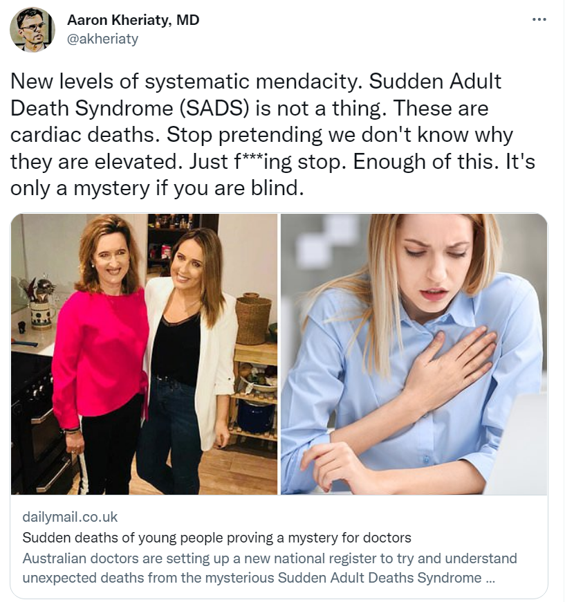 “Sudden Adult Death Syndrome (SADS) is not a thing. These are cardiac deaths” June 9, 2022 ~ ABN This cannot be due solely to doctorial incompetence. Have they been terrorized? Are they terrorists themselves? ABN Share this: Share on Reddit (Opens in new window) Reddit Share on X (Opens in new window) X Share on Facebook (Opens in new window) Facebook Share on LinkedIn (Opens in new window) LinkedIn Email a link to a friend (Opens in new window) Email Print (Opens in new window) Print Share on Pocket (Opens in new window) Pocket Like Loading... Related Published by ABN View all posts by ABN
