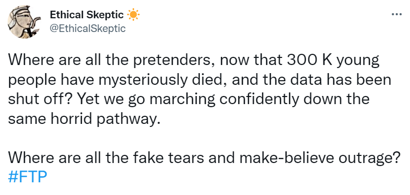 Why is data being hidden just as widespread understanding crescendos that 300,000 young Americans have died mysteriously? July 3, 2022 ~ ABN link to source Why do deaths start climbing in early 2021 just after the mass vaccine rollout? ABN Share this: Share on Reddit (Opens in new window) Reddit Share on X (Opens in new window) X Share on Facebook (Opens in new window) Facebook Share on LinkedIn (Opens in new window) LinkedIn Email a link to a friend (Opens in new window) Email Print (Opens in new window) Print Share on Pocket (Opens in new window) Pocket Like Loading... Related Published by ABN View all posts by ABN