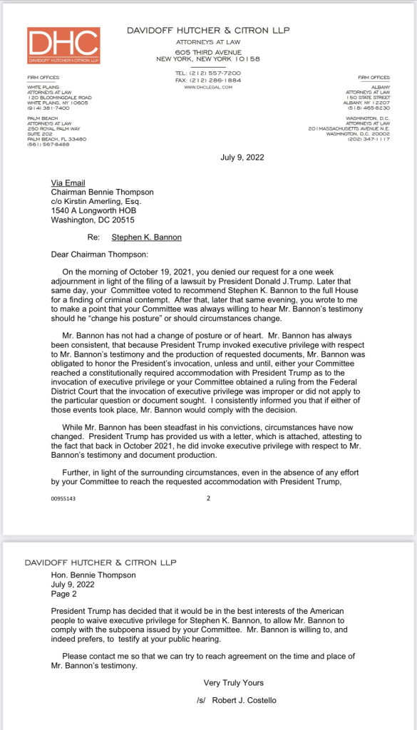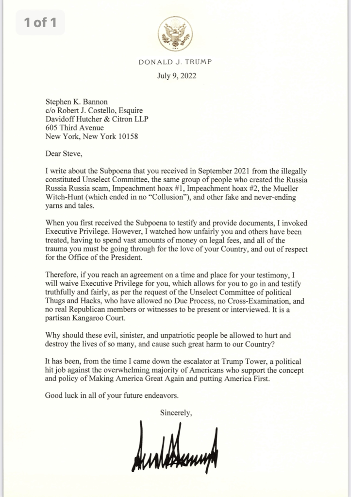 President Trump letter waiving Executive Privilege for Steve Bannon “as per the request of the Unselect Committee of political Thugs and Hacks” July 10, 2022July 10, 2022 ~ ABN Great read from our True & Actual President whose second term of office was Usurped by “political Thugs.” ABN more information after fold Share this: Share on Reddit (Opens in new window) Reddit Share on X (Opens in new window) X Share on Facebook (Opens in new window) Facebook Share on LinkedIn (Opens in new window) LinkedIn Email a link to a friend (Opens in new window) Email Print (Opens in new window) Print Share on Pocket (Opens in new window) Pocket Like Loading... Related Published by ABN View all posts by ABN