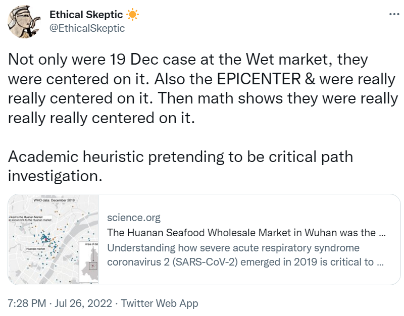 Academic heuristic pretending to be critical path investigation July 26, 2022 ~ ABN link to Tweet link to study: The Huanan Seafood Wholesale Market in Wuhan was the early epicenter of the COVID-19 pandemic Share this: Click to share on Reddit (Opens in new window) Reddit Click to share on X (Opens in new window) X Click to share on Facebook (Opens in new window) Facebook Click to share on LinkedIn (Opens in new window) LinkedIn Click to email a link to a friend (Opens in new window) Email Click to print (Opens in new window) Print Click to share on Pocket (Opens in new window) Pocket Like Loading... Related Published by ABN View all posts by ABN