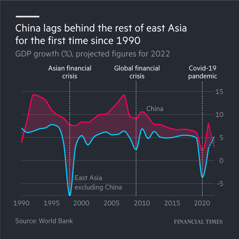 China’s economic output will lag behind the rest of Asia for the first time since 1990, according to new World Bank forecasts that highlight the damage wrought by President Xi Jinping’s zero-Covid policies and the meltdown of the world’s biggest property market. The World Bank has revised down its forecast for gross domestic product growth in the world’s second-largest economy to 2.8 per cent, compared with 8.1 per cent last year, and from its prediction in April of between 4 and 5 per cent for this year. At the same time, expectations for the rest of east Asia and the Pacific have improved. The region, excluding China, is expected to grow 5.3 per cent in 2022, up from 2.6 per cent last year, thanks to high commodity prices and a rebound in domestic consumption after the coronavirus pandemic.