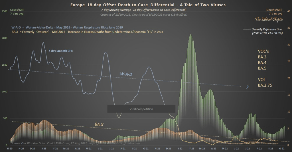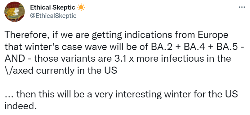 I am highlighting this graph because it is both readily accessible and highly informative. It requires some effort to understand this graph, but not that much and the data could not be displayed more clearly any other way. This image beautifully diagrams a moving event–covid infections and deaths–allowing us to grasp it as a complex whole over time. Once you understand this graph, the rest of TES’s work will be much easier to understand. I highly recommend spending the time to understand this and then following his work on Twitter and his blog. He has been doing work our health officials and academics should have been doing but were either incapable, afraid, or worst of all had bad motives which some of them surely did. ABN