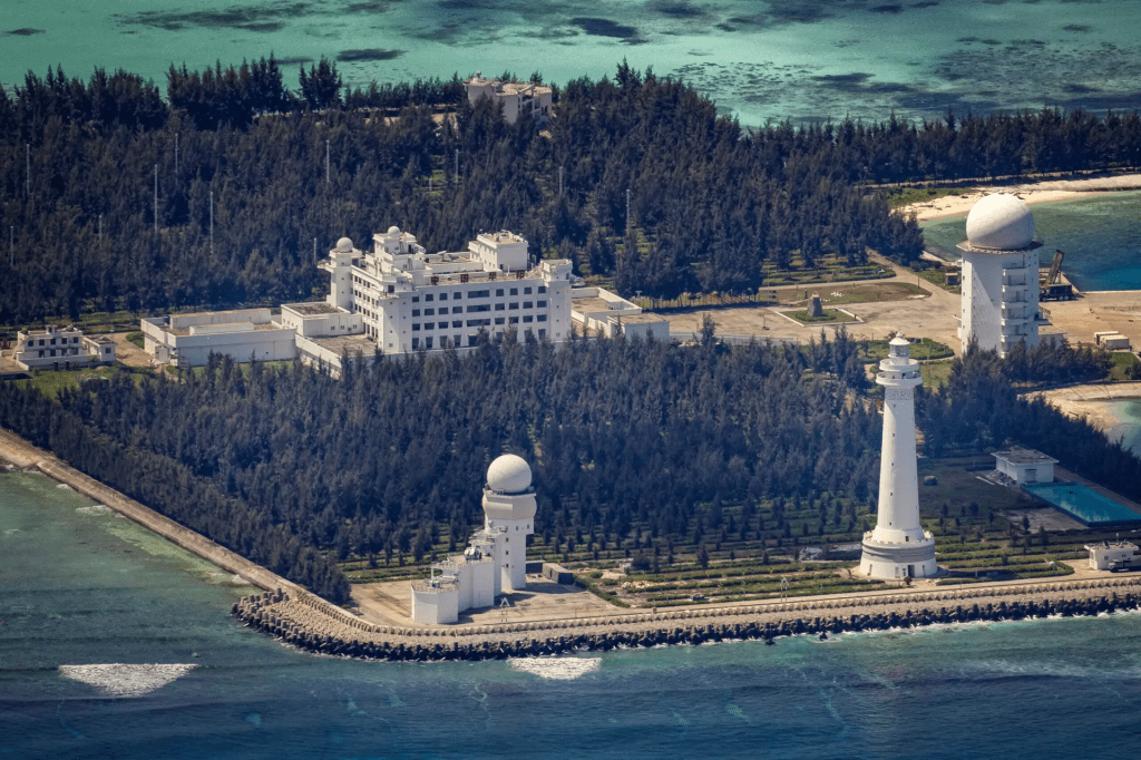 Close-ups of one island in Cuarteron Reef show naval gun emplacements on a series of towers of increasing height, backed by a radar gunnery director. Atop the battlement-like setup is a large radome. The radar’s elevated position would give it a better line of sight over the horizon.