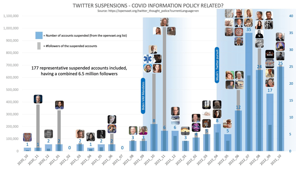 Based on some data collected at the website: OPENVAET (nice play on acronyms there) our RG colleague notes that the bans really started coming in after the first Biden VAX mandated at the beginning of September 2021 and then directly after Elon’s first signs of wanting to pursue Twitter.
