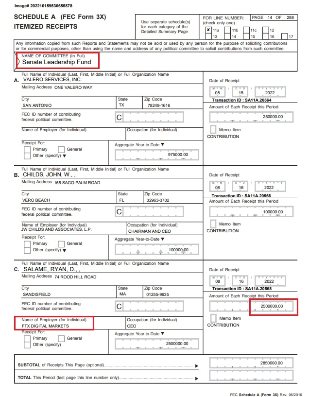 The Senate Leadership Fund is the Political Action Committee (PAC) controlled by Mitch McConnell. Within the quarterly FEC filings of the Senate Leadership Fund, we discover that in addition to funding Joe Biden and Democrats, the ponzi scheme known as the FTX cryptocurrency exchange was also funding Mitch McConnell with $2.5 million. [Document Source]