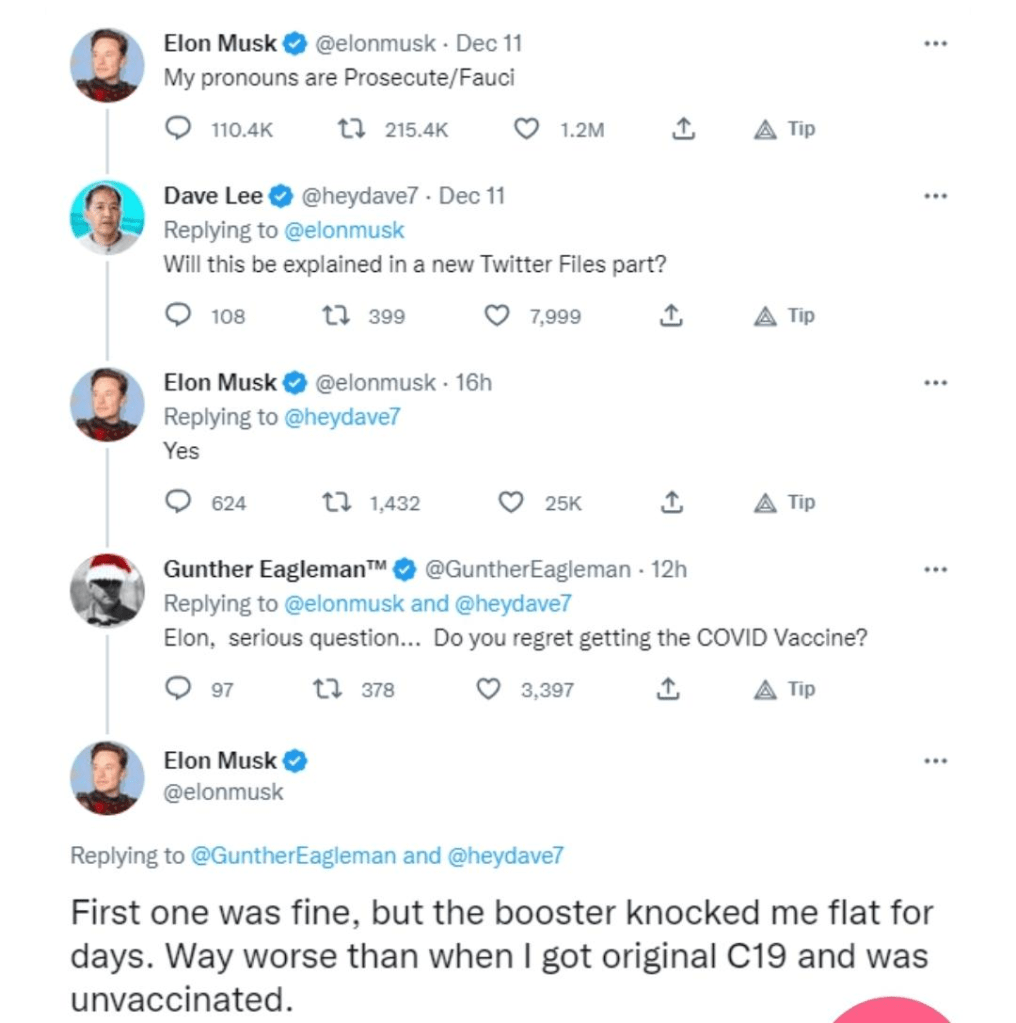 I don’t blame anyone for getting the vax but also if they did, I become quite sure that: 1) either they did not do good research or do not have the time to do it; or 2) they do not have people who did do the research talking to them and/or they are not listening. However you look at it, this subtracts substantial points from any idea we may have of Musk being super smart or prescient. This makes him seem somewhat innocent and colors his political views, which seem naive based on other evidence (voted for Brandon/Dems and now supports DeSantis very early on). And all of that makes me wonder if he really does have handlers and if those handlers are handling the Twitter revelations and not just his politics and public image. If Musk is honest and well-meaning and not controlled by handlers, I can only respect him for his bravery and apologize for throwing shade on him. I also give him credit for admitting he did get the vax and had a bad experience. ABN