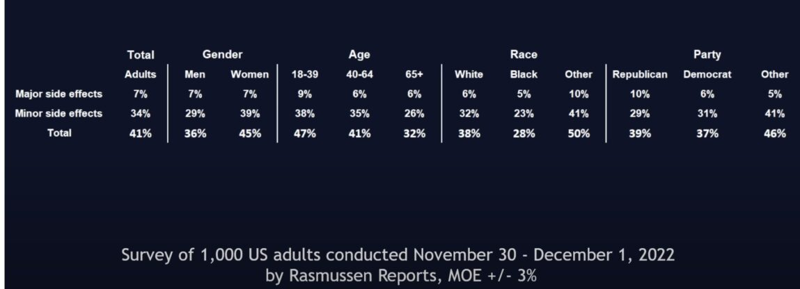 Approx. 2 years after the mRNA “vaccine” was first administered, a majority of American people are concerned about side effects association with the treatment. A recent Rasmussen poll of 1,000 U.S. American adults conducted on November 30-December 1, 2022 shows that fifty-seven percent (57%) are concerned that COVID-19 vaccines may have major side effects, including 31% who are “Very Concerned”.
