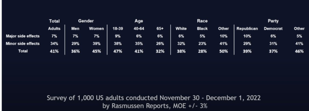 Another grim finding by the poll showed that of the vaccinated adults polled; a whopping 41% respondents had either a major (7%) or minor side effect (34%):