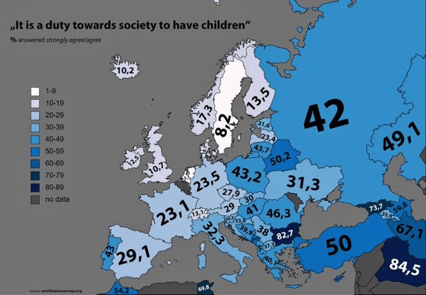 This is revealing of the weakened social bonds and self-esteem of the more woke regions of Western and Northern Europe, where there are also high levels of immigration. I wonder what the American figure is. For the record I strongly favor nationalism over globalism and individual rights over communal fantasies but I also do not believe it is anyone’s duty to have children. I do believe it is government’s duty to make life good enough and free enough that citizens are able to have children and able to want to have them. ABN