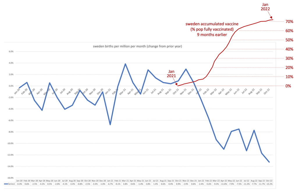 the swedish vaccine uptake data (% fully vaxxed) and shifted in 9 months right so that prospective cause stacks vertically above effect.