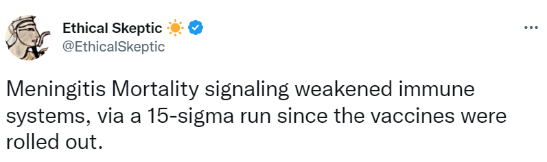 Meningitis Mortality signaling weakened immune systems, via a 15-sigma run since the vaccines were rolled out January 12, 2023January 12, 2023 ~ ABN click image for larger source; highly recommended because TES replies several times, thus clarifying some major points Share this: Share on Reddit (Opens in new window) Reddit Share on X (Opens in new window) X Share on Facebook (Opens in new window) Facebook Share on LinkedIn (Opens in new window) LinkedIn Email a link to a friend (Opens in new window) Email Print (Opens in new window) Print Share on Pocket (Opens in new window) Pocket Like Loading... Related Published by ABN View all posts by ABN