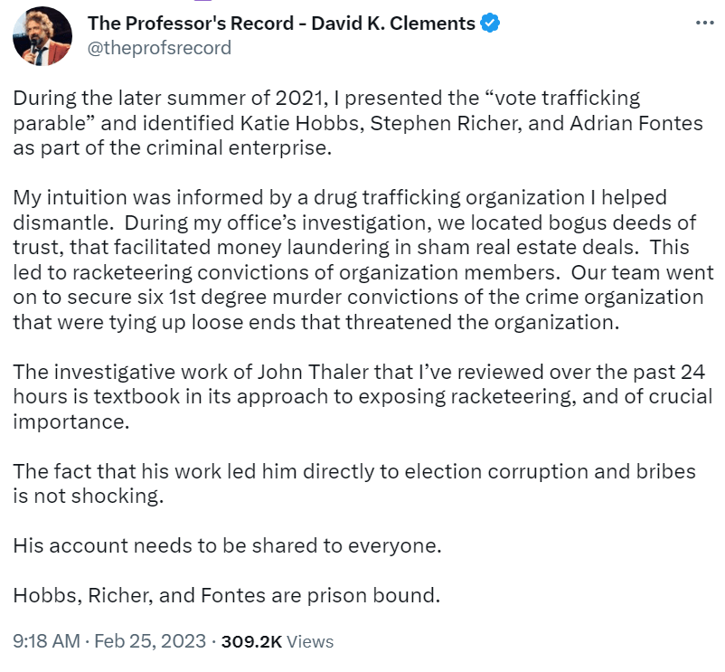 ARIZONA: ‘Hobbs, Richer, and Fontes are prison bound’ February 27, 2023 ~ ABN Since the corruption is so vast and widespread, public knowledge of it must become even more widespread. I am sure there are many other states like this, including ones bordering AZ. ABN Share this: Share on Reddit (Opens in new window) Reddit Share on X (Opens in new window) X Share on Facebook (Opens in new window) Facebook Share on LinkedIn (Opens in new window) LinkedIn Email a link to a friend (Opens in new window) Email Print (Opens in new window) Print Share on Pocket (Opens in new window) Pocket Like Loading... Related Published by ABN View all posts by ABN