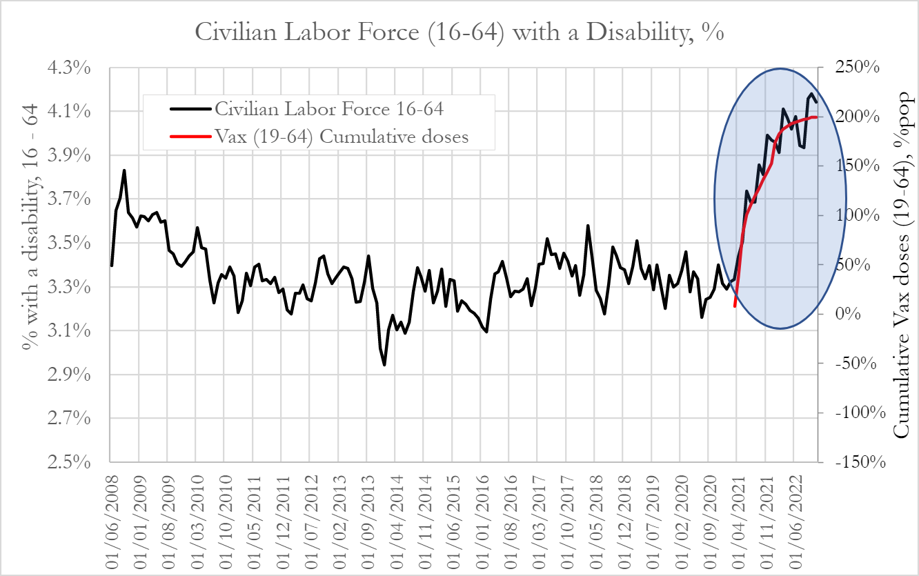 There seems to be clear evidence of a strong relationship between the Covid-19 vaccination rollout and increases in disability rates.