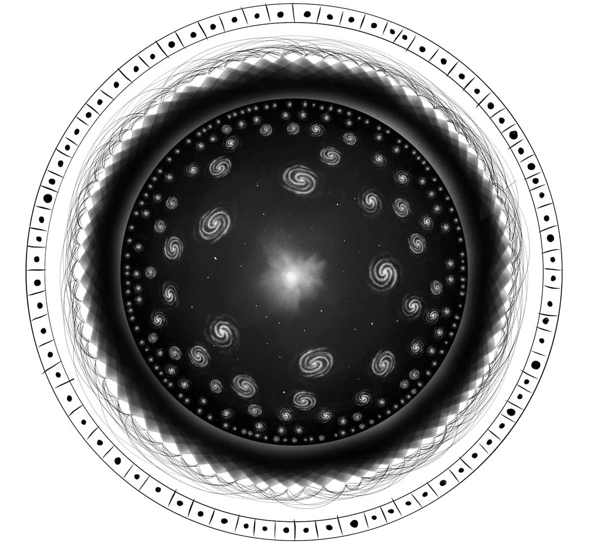 Stephen liked to visualise this idea in a disk-like image of the kind shown above. The outer circle depicts a timeless hologram consisting of countless entangled qubits.