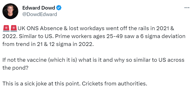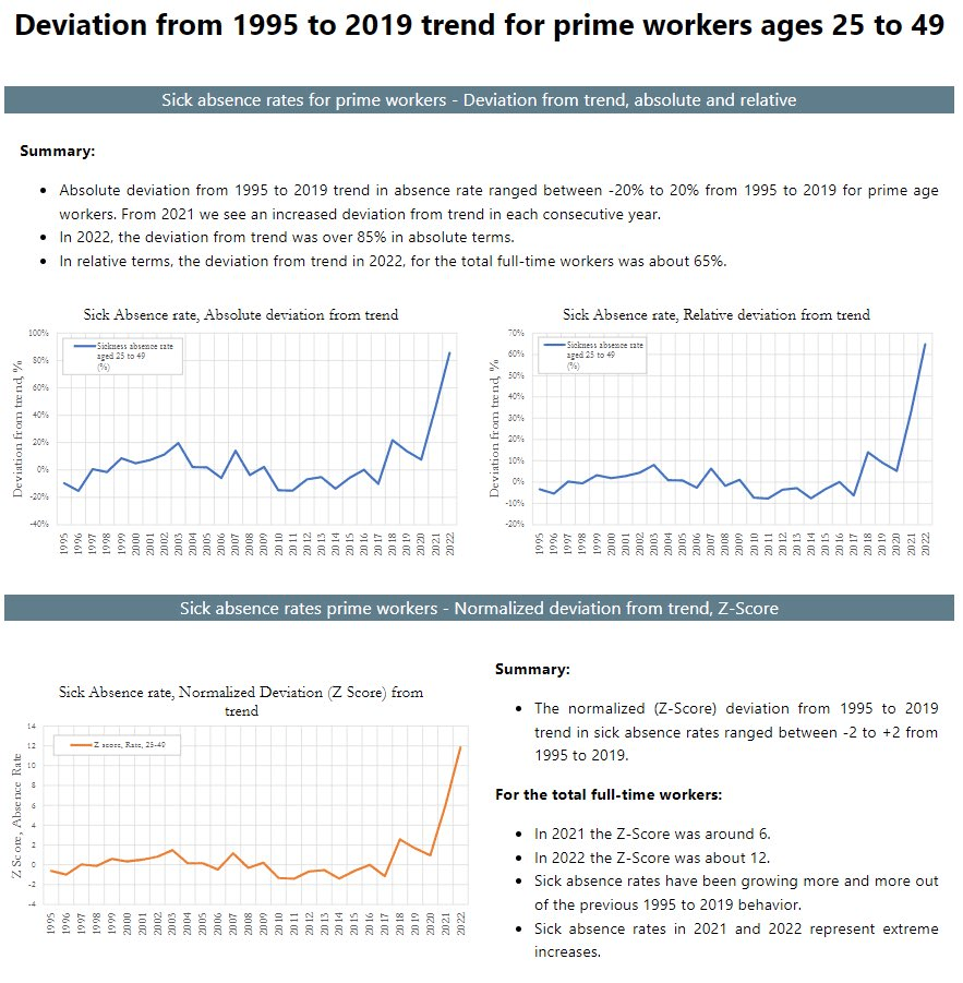Huge rise in absenteeism and lost workdays in 2021 & 2022 strongly indicate vax injury May 25, 2023 ~ ABN That these trends are being studiously ignored by authorities all but prove they know the vaxxes are the cause. ABN Share this: Share on Reddit (Opens in new window) Reddit Share on X (Opens in new window) X Share on Facebook (Opens in new window) Facebook Share on LinkedIn (Opens in new window) LinkedIn Email a link to a friend (Opens in new window) Email Print (Opens in new window) Print Share on Pocket (Opens in new window) Pocket Like Loading... Related Published by ABN View all posts by ABN