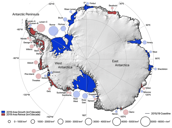 Change in Antarctic ice shelf area from 2009 to 2019