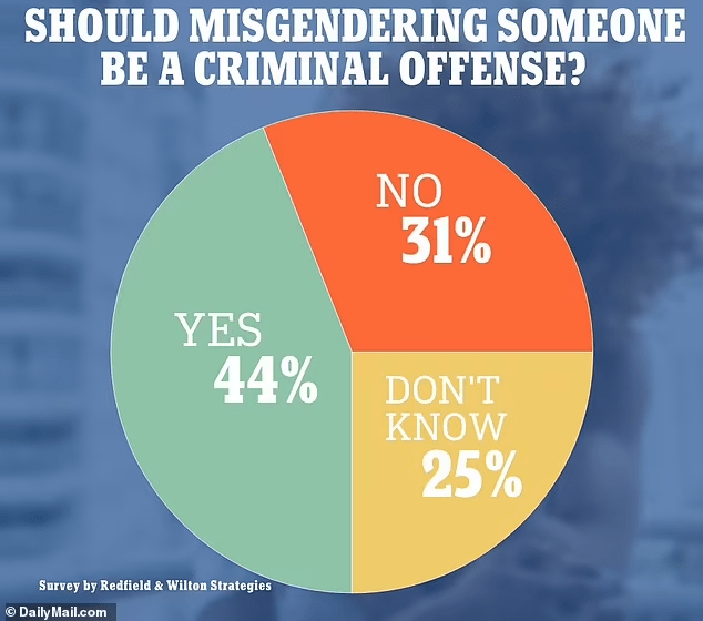 - Among those aged 25-34, 44 percent support the idea of misgendering being a criminal offense, while only 31 percent disagree