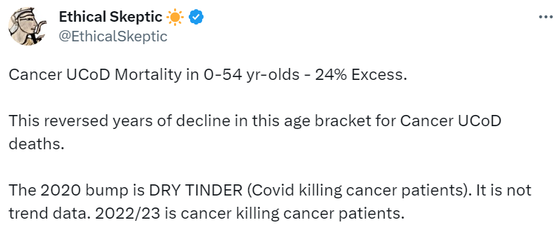 Cancer up in 0-54 year-olds August 12, 2023 ~ ABN If this is not caused by the vax, what is causing it? ABN Share this: Share on Reddit (Opens in new window) Reddit Share on X (Opens in new window) X Share on Facebook (Opens in new window) Facebook Share on LinkedIn (Opens in new window) LinkedIn Email a link to a friend (Opens in new window) Email Print (Opens in new window) Print Share on Pocket (Opens in new window) Pocket Like Loading... Related Published by ABN View all posts by ABN