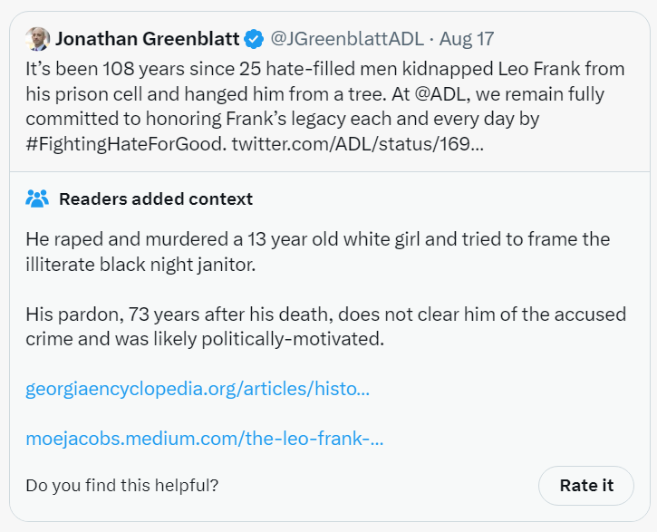 I am not a scholar of this topic but have read a few detailed essays on it. Far as I know, at the time, it was widely believed among Jews in Atlanta that Frank was guilty of murdering Mary Phagan, a thirteen-year-old employee. Somewhat weirdly, the ADL was founded in reaction to Frank’s murder conviction, which they claimed was antisemitic. Now, Greenblatt has to bring it all up again 108 years later. Whatever, today ADL seems bent on censoring as much American speech as it can get its hands on. In my view, ADL is not a good look for the American Jewish community, which is very powerful on its own and does not need the constant heckling of others served up far too often by the ADL. Nor the stirring up of very questionable old embers from 1913. ABN