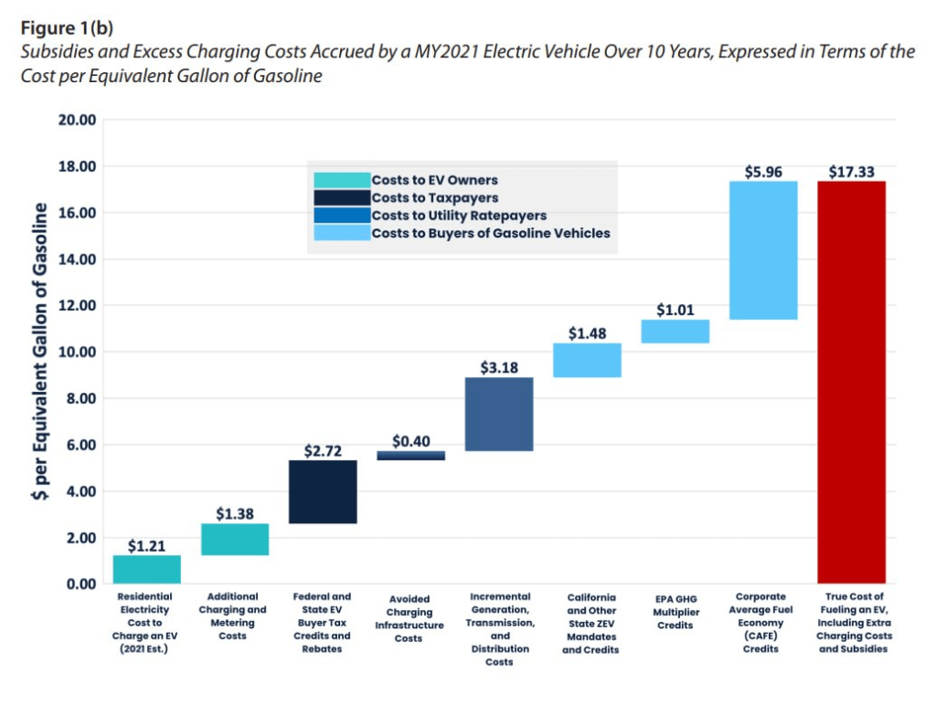 • The cost of producing electric vehicles (EVs) is far higher than the prices they are being sold for. Nearly $22 billion in federal and state subsidies and regulatory credits suppressed the retail price of EVs in 2021 by an average of almost $50,000.