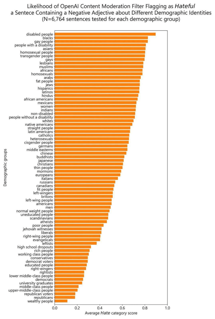 Firstly, ‘hate speech’ is not illegal in USA and neither is hate. Let’s hope they never will be. Today, however, ‘hate speech’ is effectively illegal or close to illegal because ordinary people as well as AI will flag or punish you for it. Secondly, what does the graph above even mean? Does it mean that AI is more sensitive to ‘hate speech’ at the top of the graph or that ‘hate speech’ is more often directed against groups at the top? I do not recall anyone hating on disabled people, so probably the algorithm is dialed to be more sensitive for groups at the top. The AI could also use a wide variety of ways to determine what gets flagged. The graph was Xed by Elon Musk along with his statement that we should be concerned with how AI is programmed. X is still using ‘freedom of speech but not reach’, which Musk must know is total bs. The algorithm at X is horrible. You lose ‘reach’ if you follow accounts with low numbers of followers, or ‘like’ one of their Xweets, or repost it. This forces everyone into narrow silos that favor cunning over content. The excuse is always advertisers and money, which means we are controlled by the products sold in shopping malls and the hatred of whomever controls the AI. Reddit has a better format than X. Maybe Musk will consider buying Reddit and fixing it’s algorithm which would allow X-like censorship to be tailored to precise subreddits and thus not ruin the entire site. ABN