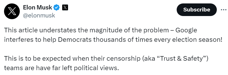 Google interferes to help Democrats thousands of times every election season! — Elon Musk