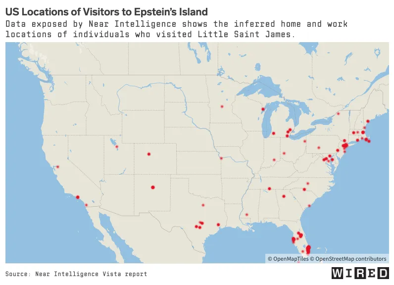 …11,279 coordinates obtained by WIRED show not only a flood of traffic to Epstein’s island property—nearly a decade after his conviction as a sex offender—but also point to as many as 166 locations throughout the US where Near Intelligence infers that visitors to Little St. James likely lived and worked. The cache also points to cities in Ukraine, the Cayman Islands, and Australia, among others.