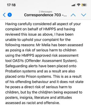 Sam Melia’s wife complained about the prison saying he can no longer speak to or even hear about his daughter and this was their response.