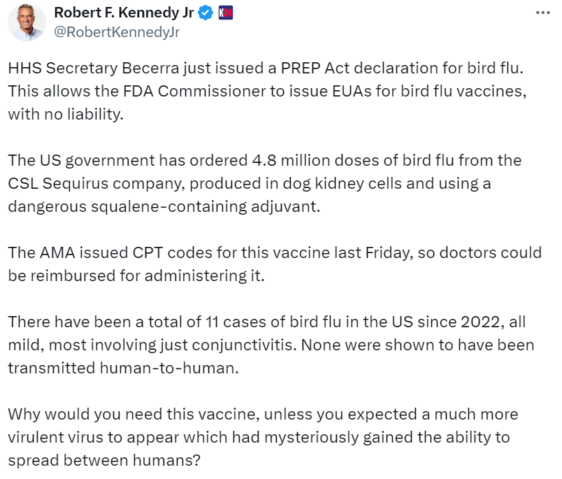 PREP Act declaration for BIRD FLU issued July 27, 2024 ~ ABN Like the open border and the covid plandemic, this appears to be yet another act of asymmetric warfare against the citizens of USA. ABN Share this: Click to share on Reddit (Opens in new window) Reddit Click to share on X (Opens in new window) X Click to share on Facebook (Opens in new window) Facebook Click to share on LinkedIn (Opens in new window) LinkedIn Click to email a link to a friend (Opens in new window) Email Click to print (Opens in new window) Print Click to share on Pocket (Opens in new window) Pocket Like Loading... Related Published by ABN View all posts by ABN